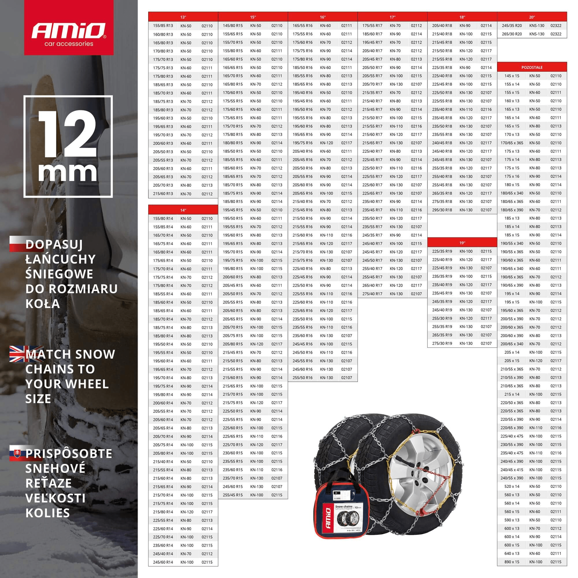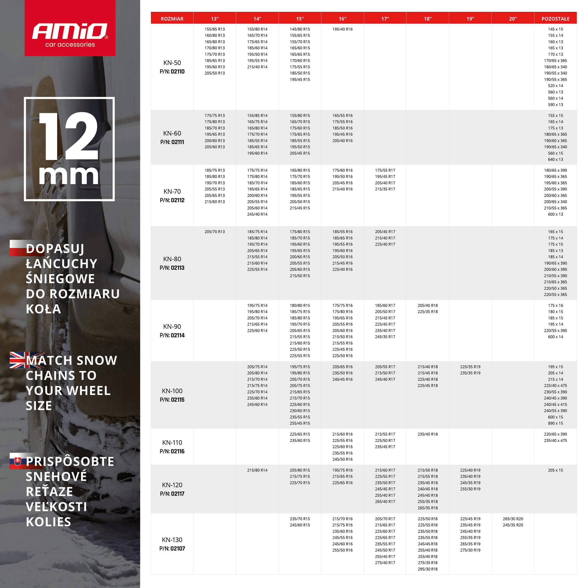 Die Amio -Schneeketten KN100 sind für Fahrzeuge bis zu 1800 kg ausgelegt und bieten zuverlässige Griffe auf schneebedeckten und eisigen Straßen. Diese Ketten bestehen aus temperamentvollem Stahl mit einer Schalthöhe von 12 mm, was eine langfristige Leistung und Haltbarkeit gewährleistet.