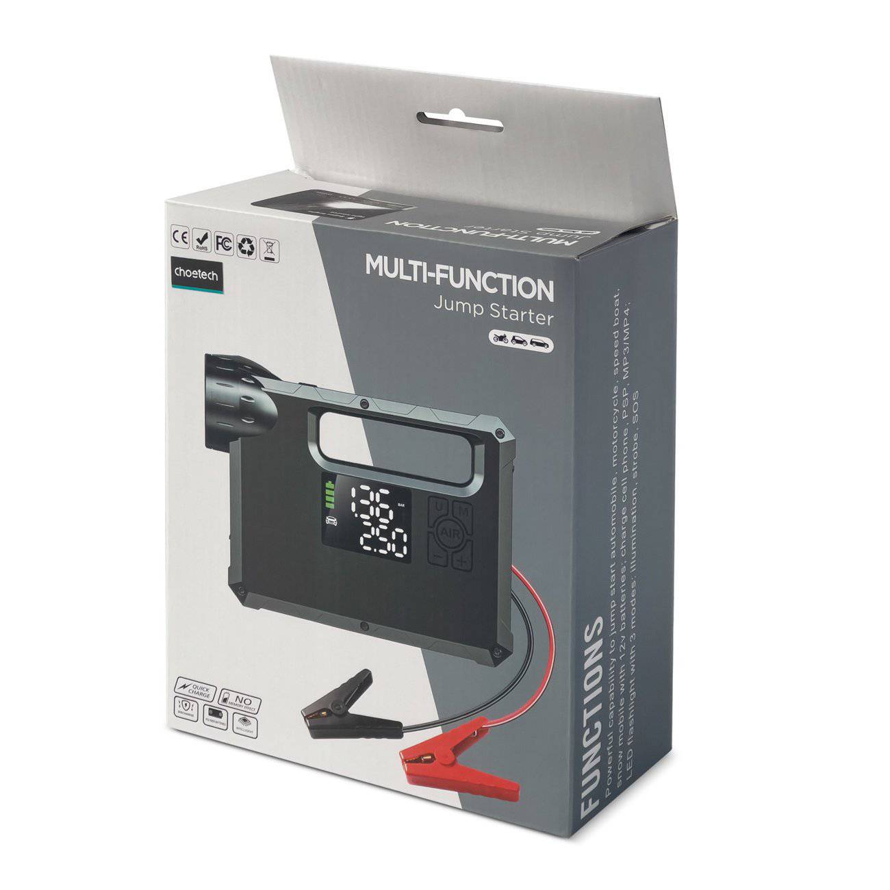 Ein super praktisches Gerät für jeden Auto -Enthusiasten? Sicherlich ein Sprungstarter mit einem Kompressor. Das Choetech TC0017 -Modell verfügt außerdem über zwei zusätzliche Funktionen: eine Power Bank mit einer Kapazität von 8000 mAh und eine Taschenlampe. Damit können Sie das Auto nicht nur in der Kälte starten, sondern auch den Reifen aufladen, Ihr Telefon aufladen oder den Platz nachts beleuchten. Es ist ein sicheres und praktisches Gerät.