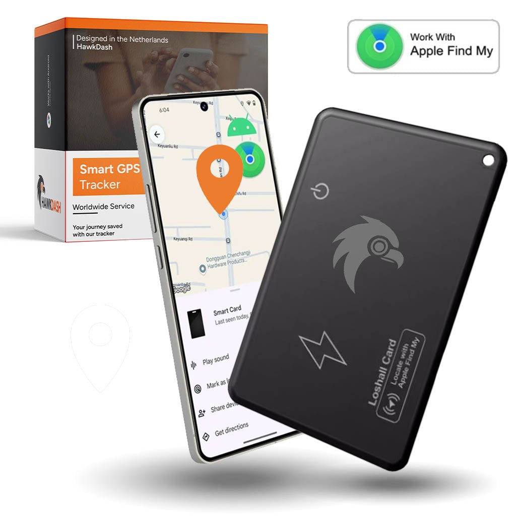 HawkDash Ultradünne globale GPS-Trackerkarte für iOS und iPhone – Kabelloses Laden, wasserdicht, Smart Wallet Tracker, kompatibel mit Apple „Mein Gerät suchen“.