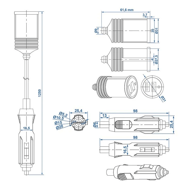 • Doppelte USB -Anschlüsse: 2weg USB -Port -A -Ports, mit denen Sie zwei Geräte gleichzeitig über ein Zigaretten -Feuerzeug aufladen können.