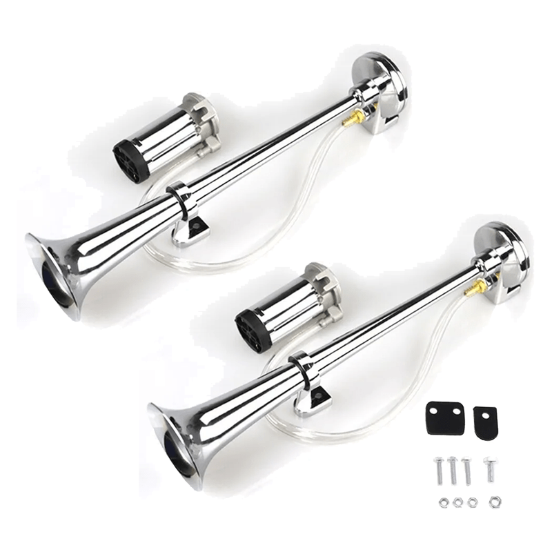 Super lautes Lufthorn für das Auto. Legen Sie es leicht unter die Motorhaube und schließen Sie es an einen Schalter oder direkt an das Horn an. Dieses Zughorn bläst die Luft durch die Trompete durch einen (Mini-) Kompressor und erreicht nicht weniger als 115 Dezibel! Sluit de treinhoorn gemakkelijk aan op je eigen accu (12V enkele accu) en maak gebruik van deze zeer krachtige hoorn met één simpele druk op de knop.